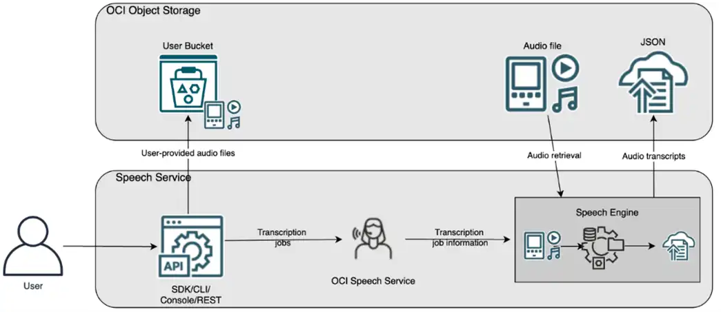- Easy to integrate: OCI Speech offers versatility through its accessibility via REST APIs, various SDKs, and Oracle CLI, meaning developers can effortlessly implement a scalable speech service.